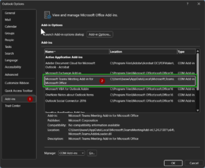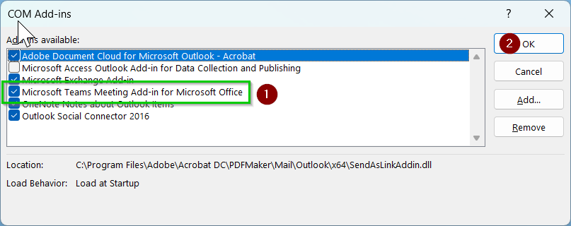 - Go back to the Add-ins screen, and check if the Microsoft Teams Meeting Add-in for Microsoft Office is enabled again.