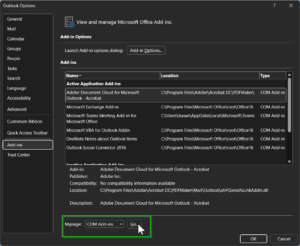 - Open the Add-ins tab in the left menu and look for Microsoft Teams Meeting Add-in for Microsoft Office in the list of disabled add-ins (mine isn’t in the screenshot, but please check the disabled list)