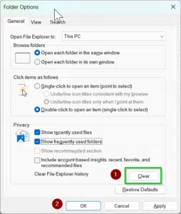 If you want to clear all current entries in Quick Access, follow the steps above to access Folder Options and click the Clear button in the Privacy section.