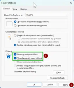 By unchecking these options, Quick Access will no longer automatically display recently or frequently used folders.