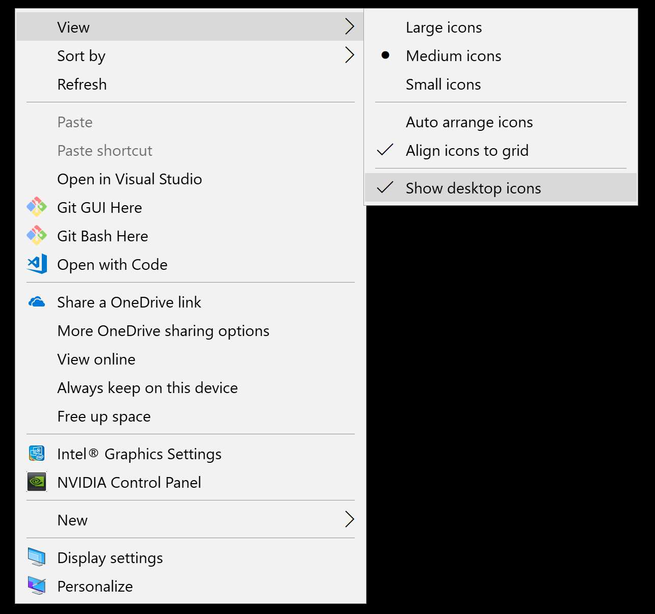 Here you see Show desktop icons as last in the menu. If correct, it should not be checked at the moment. Your desktop icons should reappear after clicking Show desktop icons.