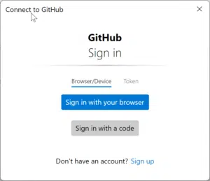 After doing a pull the Connect to GitHub screen popped up and I was able to log on with Sign in with your browser option.