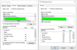 Here you’ll see all users and groups that have permissions to this directory. The NETWORK SERVICE user needs full control over C:\Windows\System32\IAS.